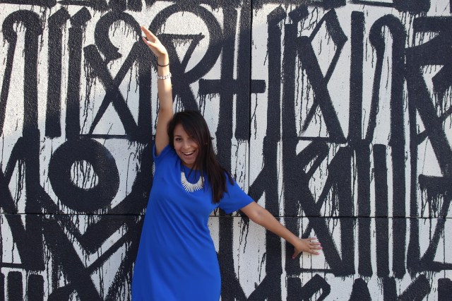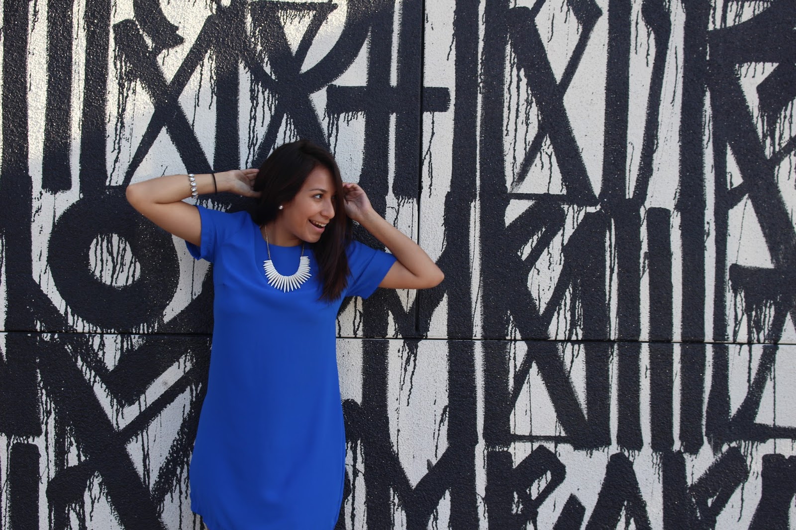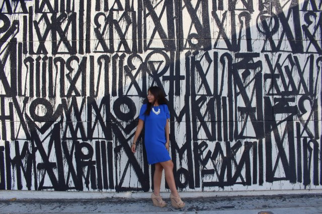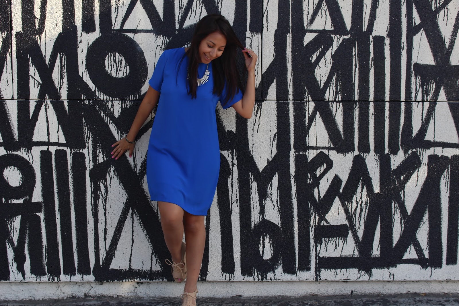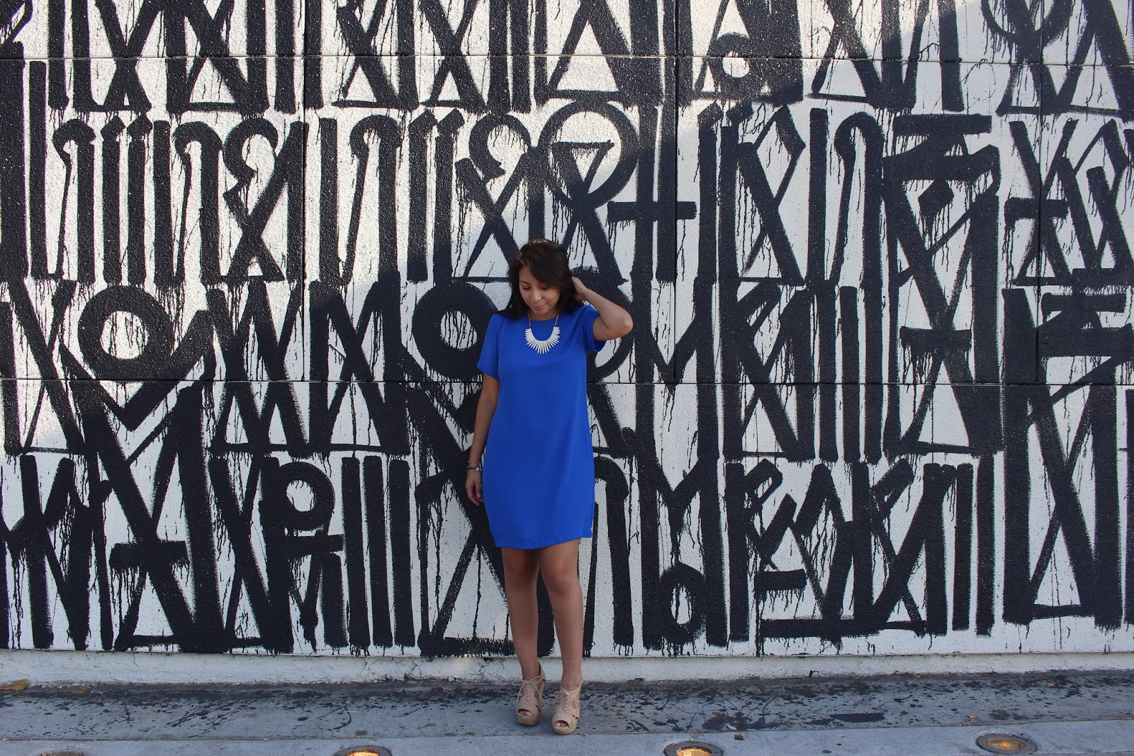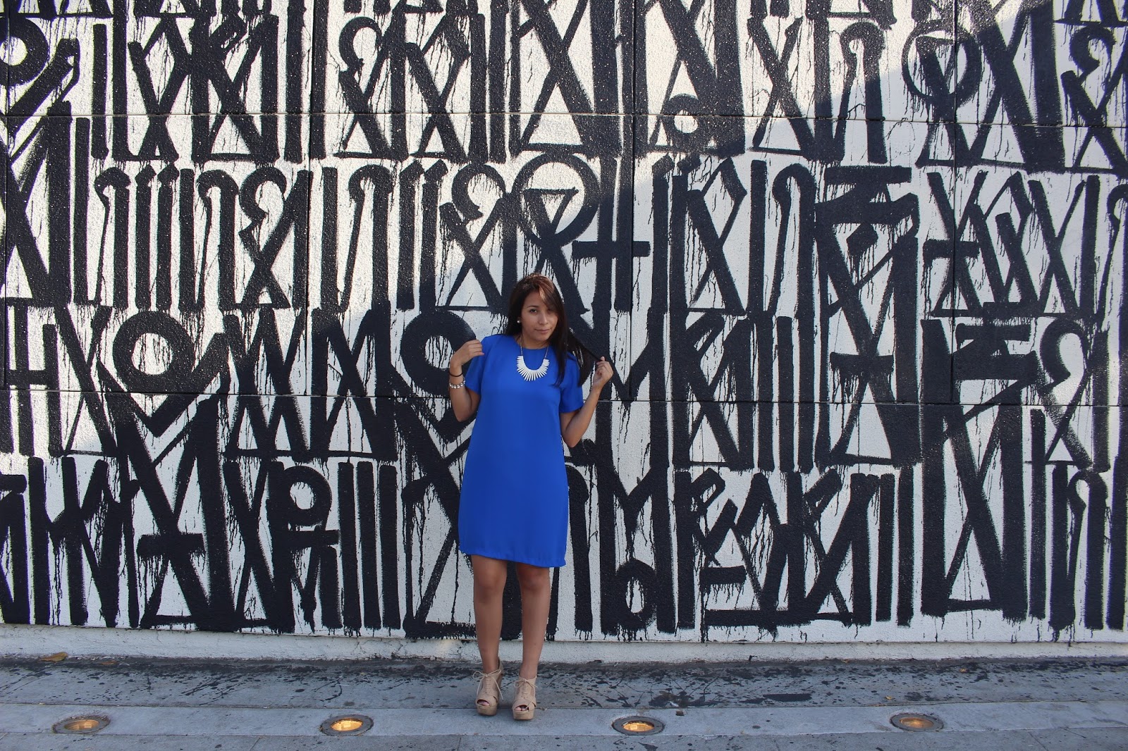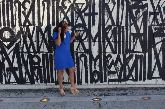 I loved how there are so many places in LA that have great photo ops. There was so many things that I could do with this wall so instead of the typical red that came to my mind, I chose a blue dress. I love the bright color especially for my skin tone. I also love the spiked necklace to go with it. The wedges are a neutral color since the two pieces are already such statement pieces.