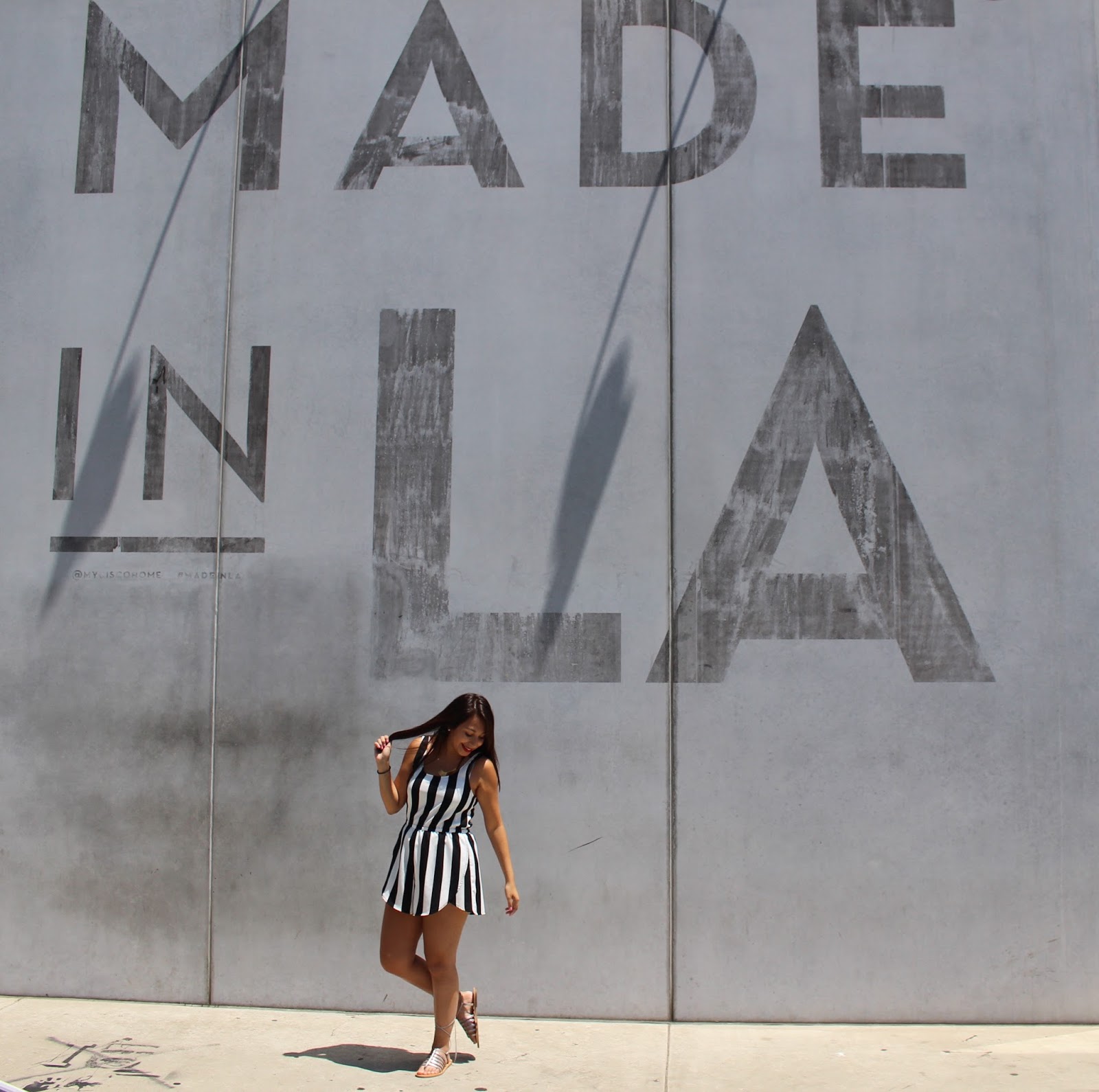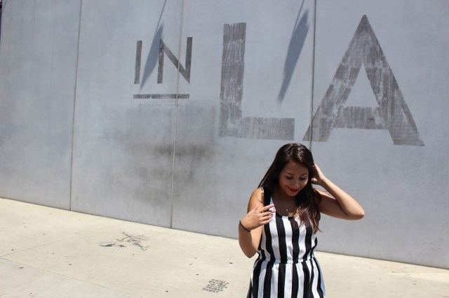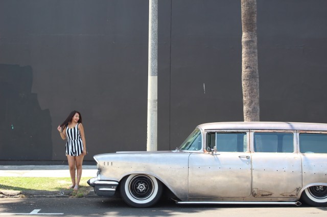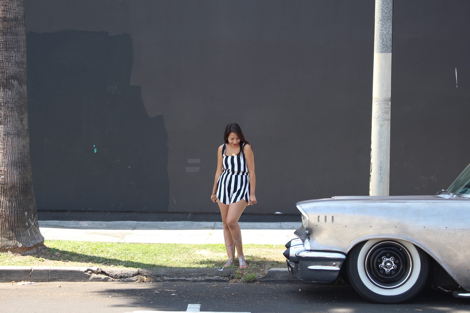 I was not in fact made in LA. Not much of a confession, huh? Oh well I tried. I did however fall in love with the creation of this post. This was one of my favorite posts to shoot in LA mostly because I loved my outfit. Also because I love how all of the darker colors came together from the walls, to my outfit, shoes, and the car. My boyfriend says I look like I belong in jail but you cannot go wrong with black and white stripes! Pair with some simple gold jewelry and a red lip and you’re perfect. How cool is the vintage car btw?! Ugh I had to shoot with it!