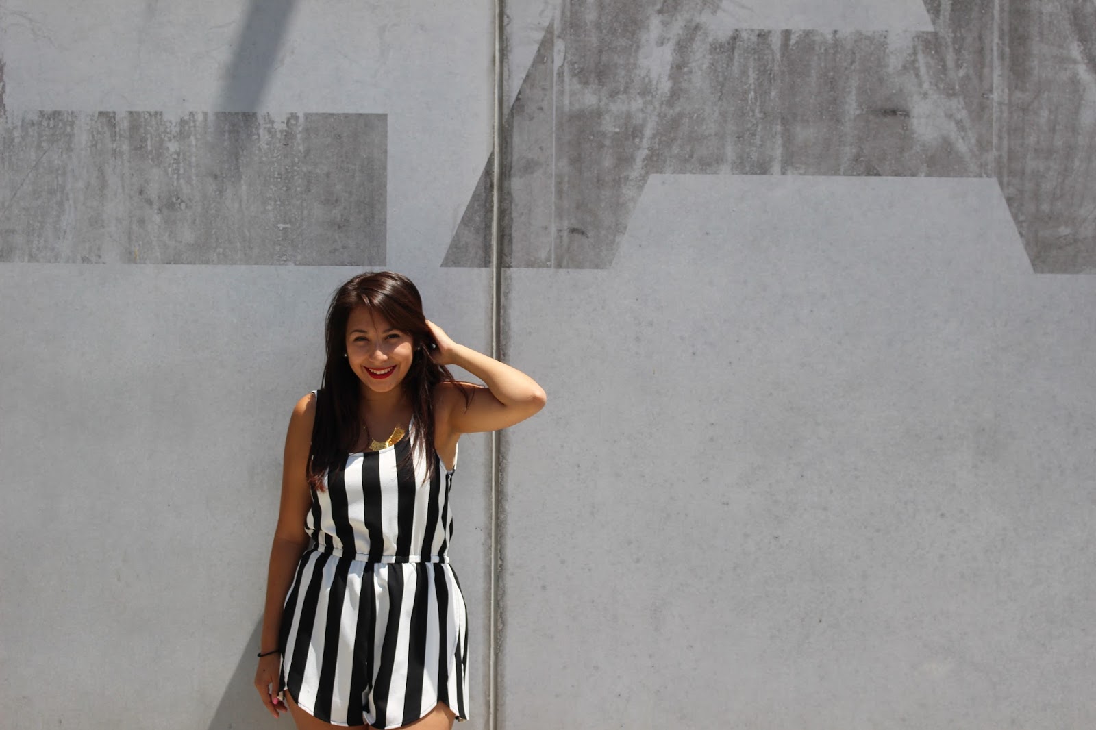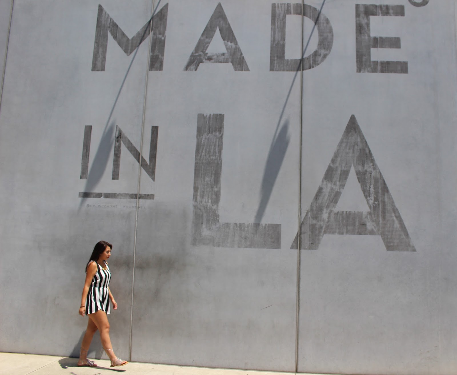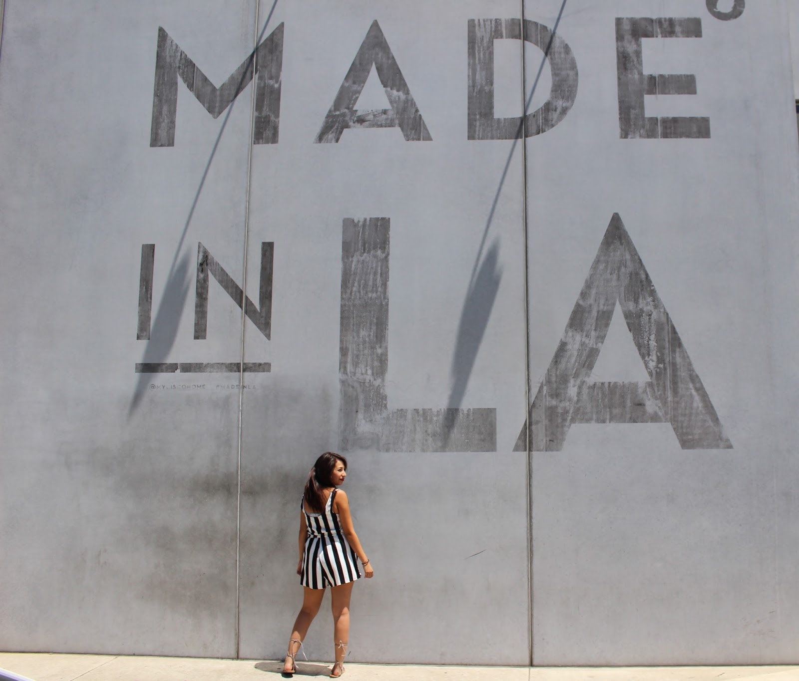 I was not in fact made in LA. Not much of a confession, huh? Oh well I tried. I did however fall in love with the creation of this post. This was one of my favorite posts to shoot in LA mostly because I loved my outfit. Also because I love how all of the darker colors came together from the walls, to my outfit, shoes, and the car. My boyfriend says I look like I belong in jail but you cannot go wrong with black and white stripes! Pair with some simple gold jewelry and a red lip and you’re perfect. How cool is the vintage car btw?! Ugh I had to shoot with it!
