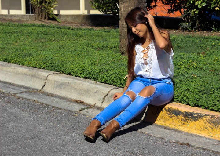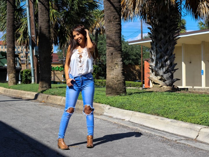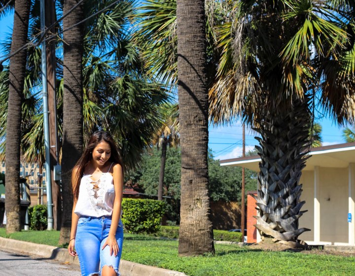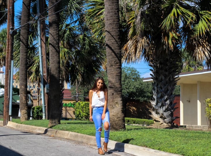 I realized while editing these photos that the only thing “fall” about these pictures are my booties. I probably should not have taken pictures by these super green palm trees but I loved how it looked. I just had to sneak this outfit into the blog before I start my fall looks because 1. it still feels like Summer in Texas and 2. I love how these pieces look together. My top and the jeans are both from Showpo and are linked below. I so love how these jeans give a high waisted effect and the top details are definitely my favorite.