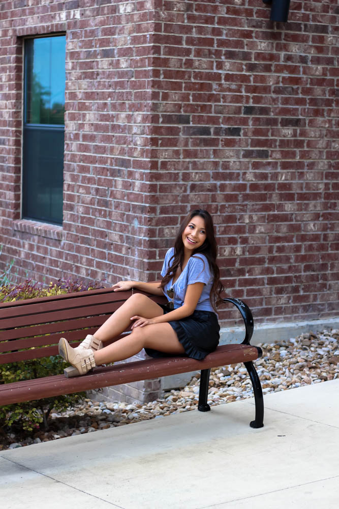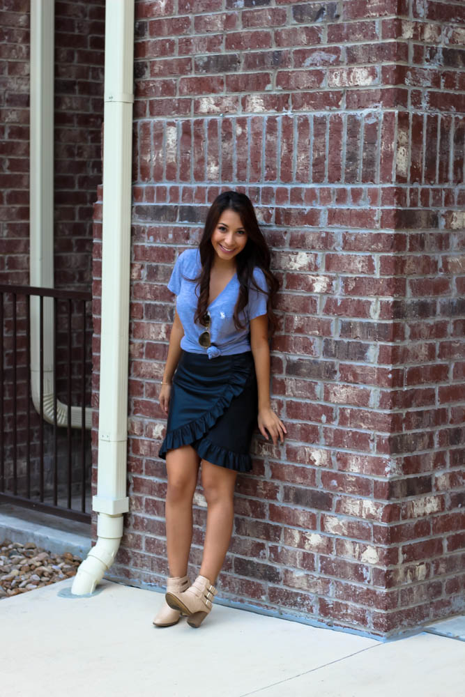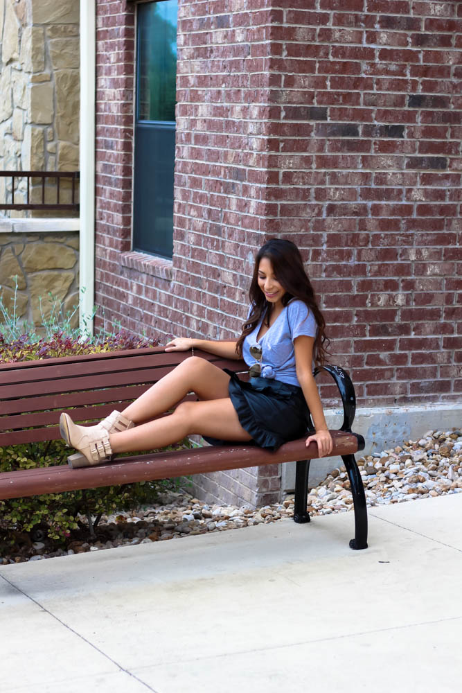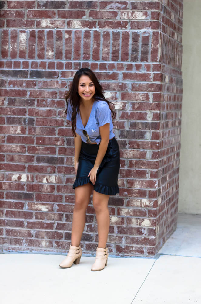 Can we just talk about this skirt for a sec? Like not only is it the perfect faux leather, but I am obsessed with the ruffles! The ruffles add a feminine touch which I am definitely all about! I love it and I cannot get enough ruffles! Also, the way the dress flaps over at the front is one of my favorite features as well. This look went well with a plain gray tee and booties which are my basic pieces to compliment my statement piece. Having too many statement pieces in one outfit can get to gaudy or take away the attention from the other piece, a good mix is everything!