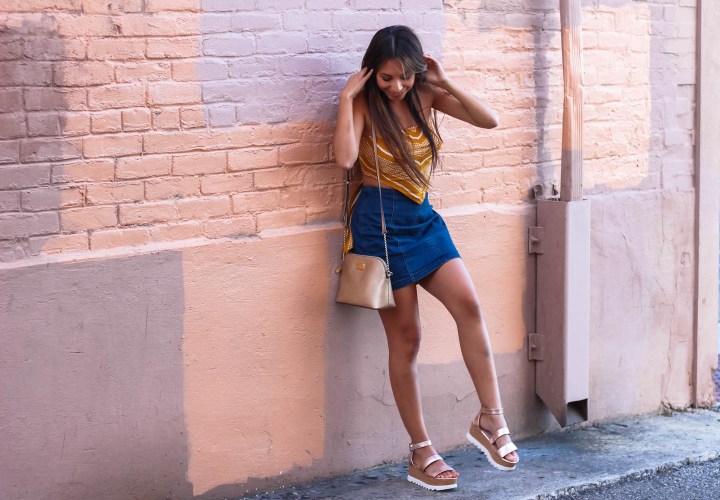 Top : (similar) (similar) // Skirt : Free People // Shoes : Steve Madden // Purse : Kate Spade (similar)