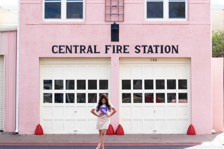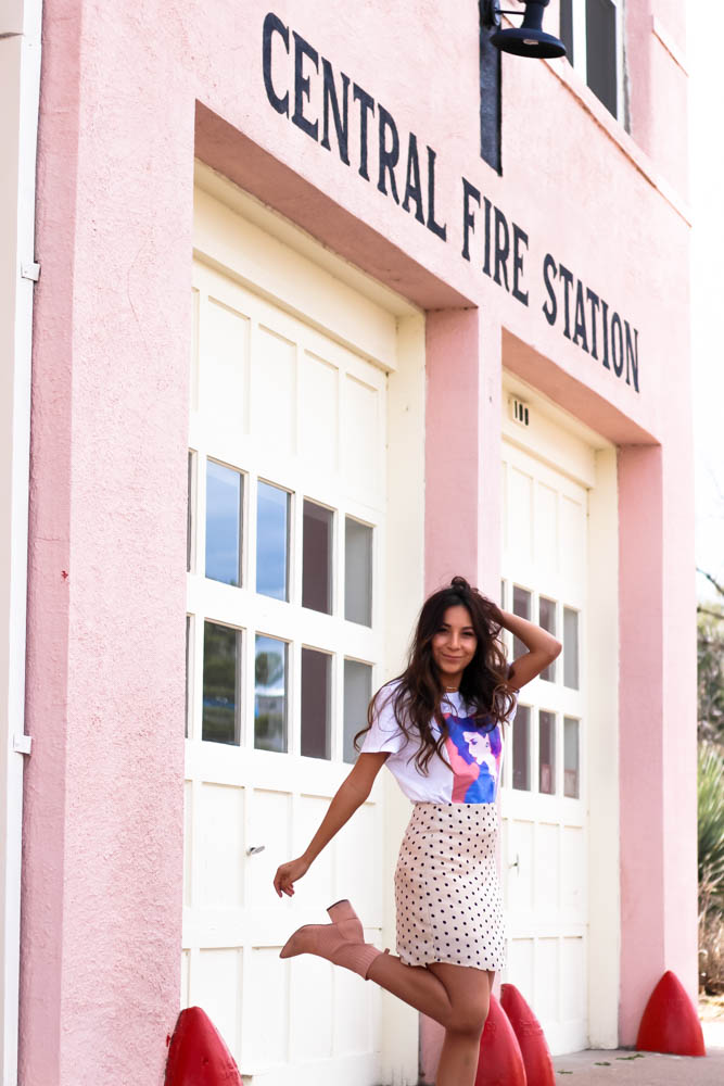 Also, how cute is this pink fire station?! I found it while searching for Marfa on my way home to Texas and I knew I had the perfect outfit for it! I actually thrifted this skirt from a downtown store in LA and it was only $20! I also have been wearing this shirt on repeat because I just love the color and there are so many ways to style it! For more outfit inspo on styling a graphic tee check out my latest blog post!