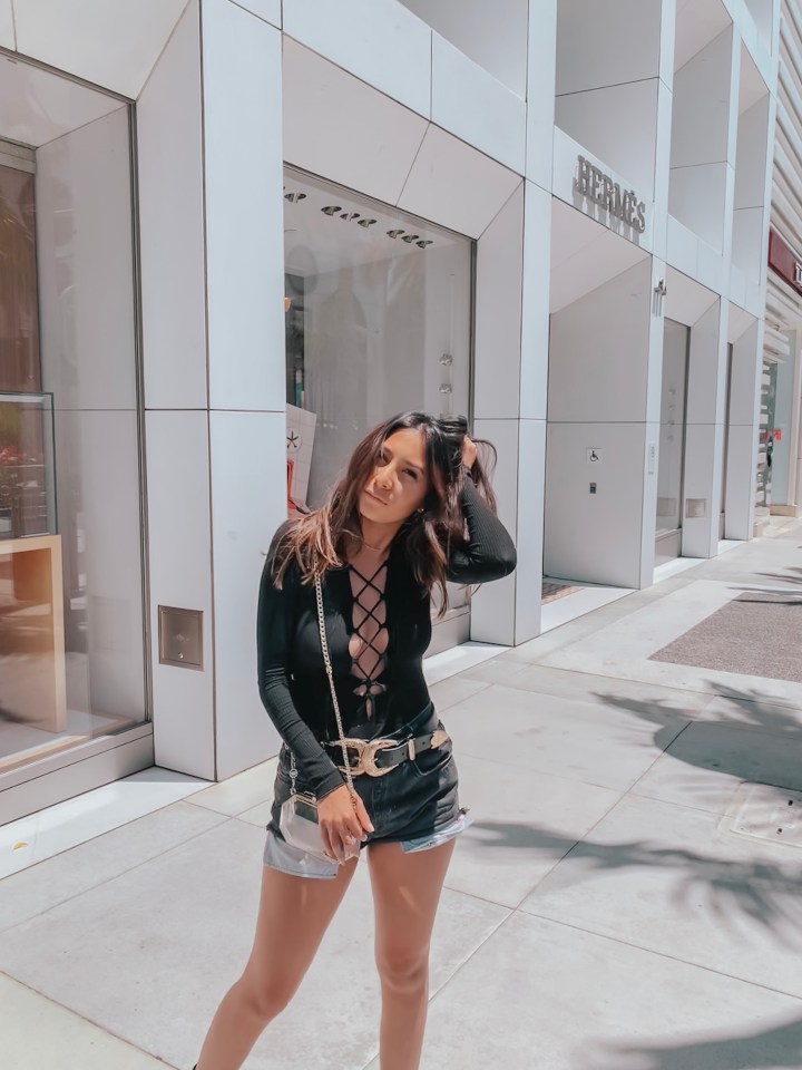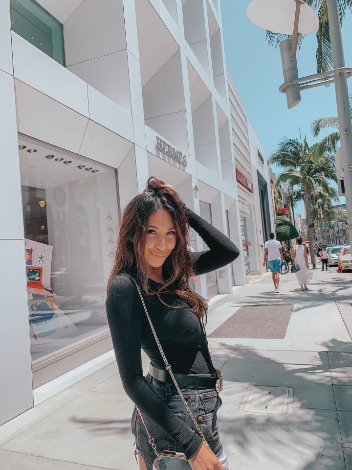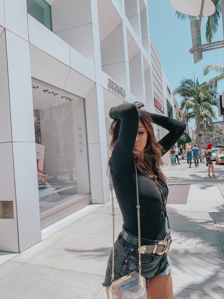 So I did this look almost to a T, but I could not find an exact top. I did, however, have this plunging long sleeve from Reformation that I loved and the only real difference besides the added criss-cross on the front is the choker and the loose sleeves. I added the double belt buckle for extra oomph and to add to the gold effect of the chain on my bag. This is such a chic weekend look. I have gotten into the habit of making sure I wear the outfits that I shoot either to work or during the weekend. This one I believe I am going to wear to one of the next events I attend.