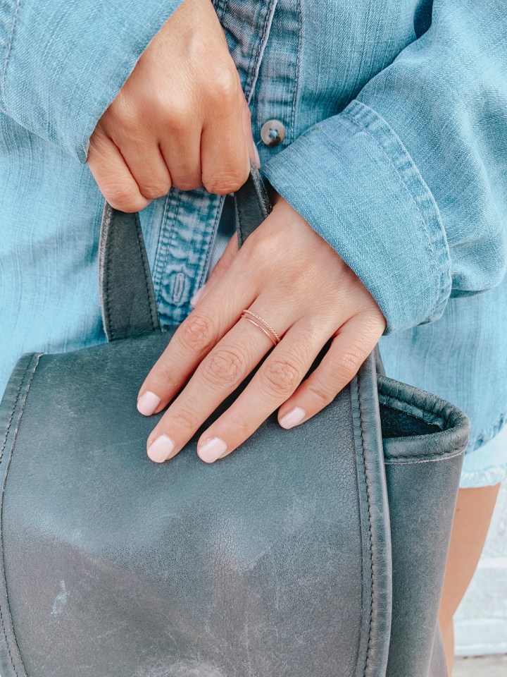 Let’s talk outfit details: So besides the denim pieces I can’t get enough of, another one of my outfit musts is these stackable rose gold rings from Aurate. I seriously fell in love with wearing rings in high school because I truly loved the way my hands looked when I would write or type. I have the SMALLEST hands and so dainty rings like this look amazing.