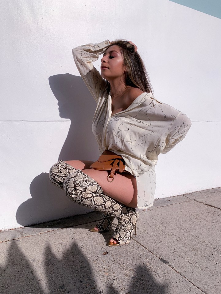 Thank you again to Lulu’s for gifting me with this amazing top! I have honestly been wearing it non-stop and this belt bag is to DIE for. My shoes were also gifted from ShoeDazzle and I am head over heels for the thigh-high snake print because I cannot resist a good thigh-high!