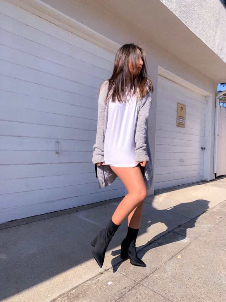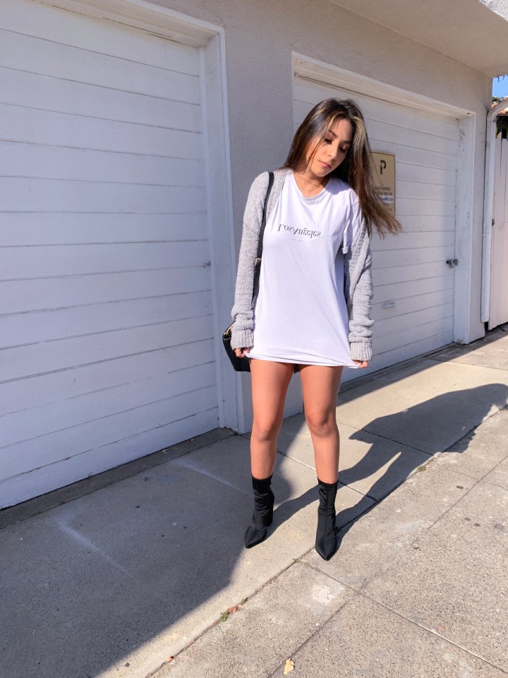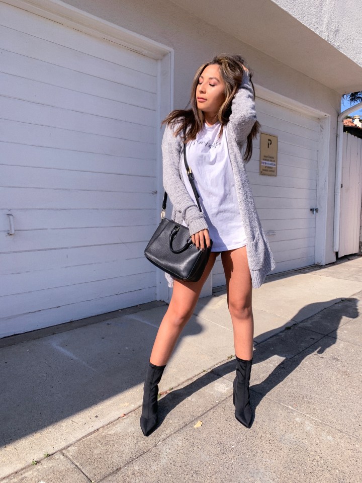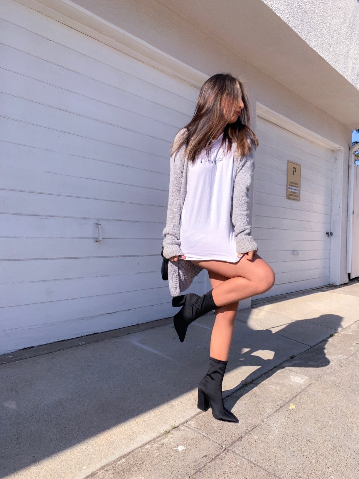 Okay, now on to the post! I actually stole this outfit idea from a friend on Instagram! I loved the outfit so I thought I’d dress it up a bit. Change up the shoes and add some sweatpants and you’re comfy as can be! What really changed it was the shoes!
